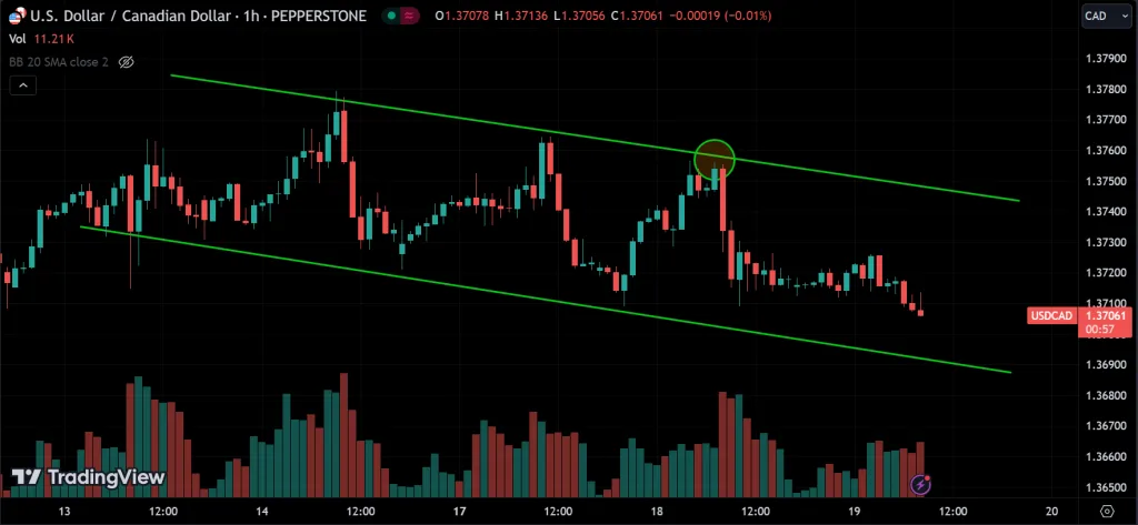 - Selling in a Descending Channel: Traders often sell when the price is near the upper resistance line and buy to cover when it approaches the lower support line.