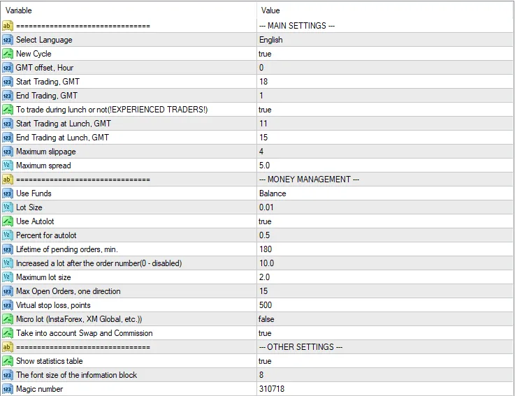 The Forex robot works at certain time intervals at the beginning of the American session, when it is early morning or early lunchtime in Canada. During these intervals, the Forex trading robot opens every hour pending orders in both directions: Buy Limit and Sell Limit, at a distance of 10 points from the current price (for 4-digit quotes) or 100 points from the current price (for 5-digit quotes).