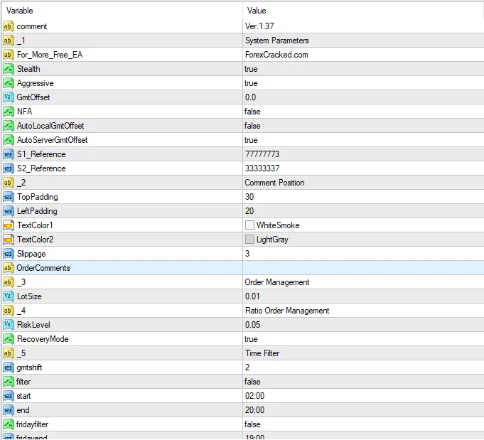 S1_Reference: This parameter is used to identify “Strategy 1” trades. This is one of the primary methods that unscrupulous brokers use to identify which robot(s)you may be using, so it is strongly suggested that you enter a random (or, at least, non-default) value here. Changing the value regularly is also highly recommended.