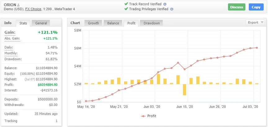 I have been using the Orion Scalper EA since 2 weeks on M5 timeframe with $1000 deposit with ICMarkets real account. Getting minimum 1% profit daily and 10% weekly. One of the best EA.