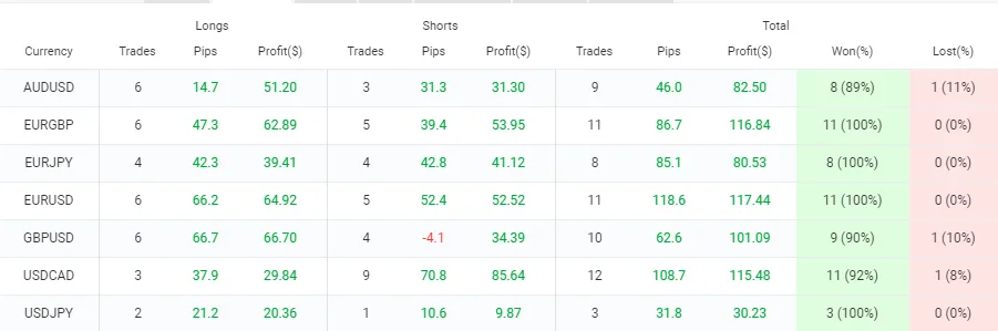 • It only trades on The chosen pairs on Settings (EURUSD, GBPUSD, USDJPY, USDCAD, AUDUSD, EURGBP, USDCHF)