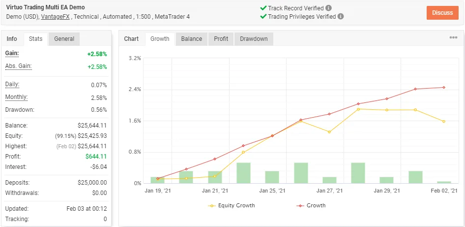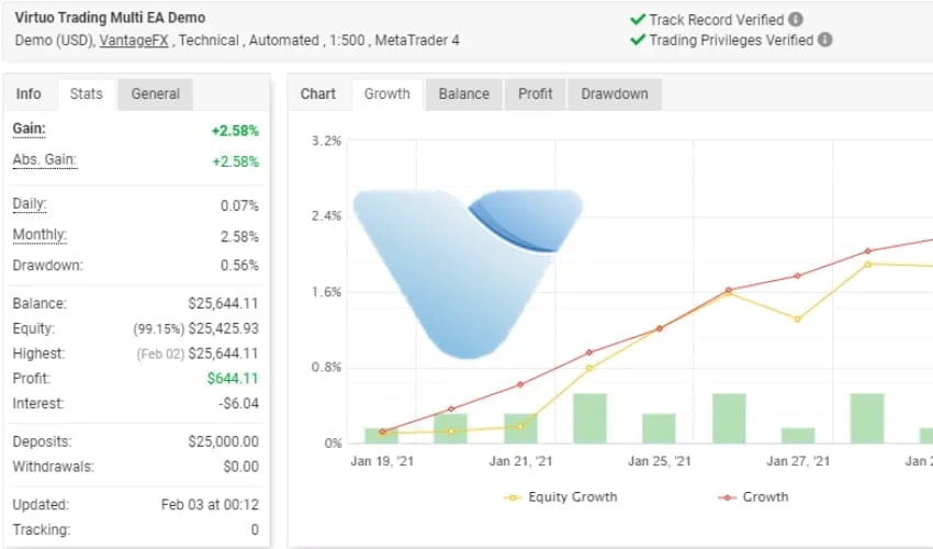 Virtuo Multi Trading EA works based on various indicators, moving averages, stochastic, and so on. It trades only on 6 major pairs. This EA has been programmed to provide 5-10% a month.