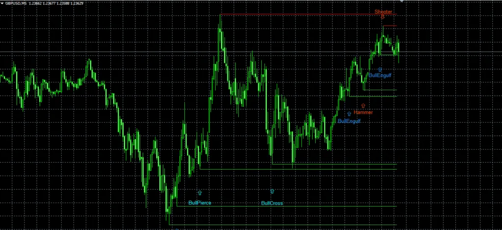 This indicator recognizes about 40 candlestick traders patterns and draws their names with green and red arrows on the chart: