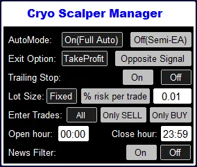 - News Filter – You can set your Сryo Scalper Manager to avoid opening any trades during news announcements automatically.