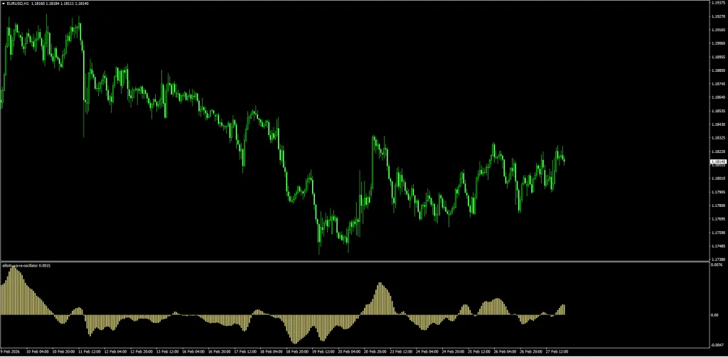 - Step 1: Apply the Indicator – Load the Elliott Wave Oscillator on your MT4 or MT5 chart. The histogram will appear in a separate window below the price chart. Positive bars indicate bullish momentum, negative bars indicate bearish momentum.
