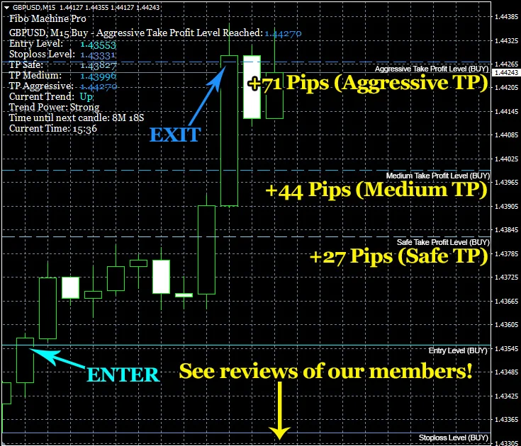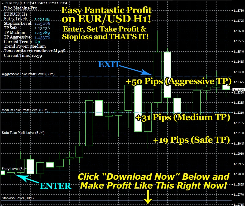 The most distinctive feature of the Fibo Machine Pro is its color-coded levels that signify entry points, stop-loss levels, and three distinct take-profit levels. This visual representation simplifies decision-making and aids traders in quickly identifying strategic points on their charts.