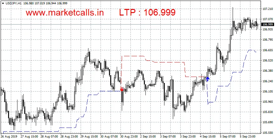 A blue arrow pointing up is a buy signal, while a red arrow pointing down is a sell signal. Additionally, the indicator acts as a support or as resistance and it can be used as a trailing stop loss for the existing trade.