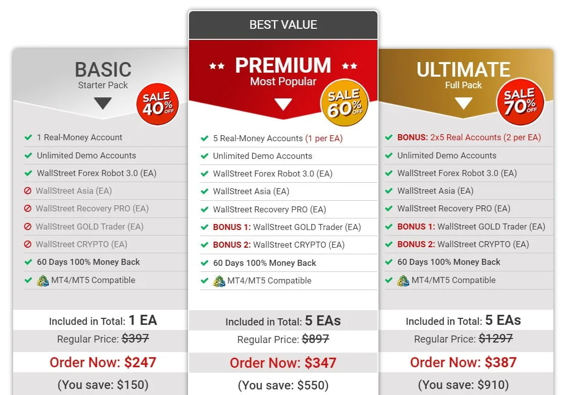 The WallStreet Forex Robot 3.0 has three different plans. The packages start at $247 at discounted rates. Frist Package (BASIC) only includes WallStreet Forex Robot 3.0 But the other two packages (Premium, Ultimate) includes 4 more forex robots.